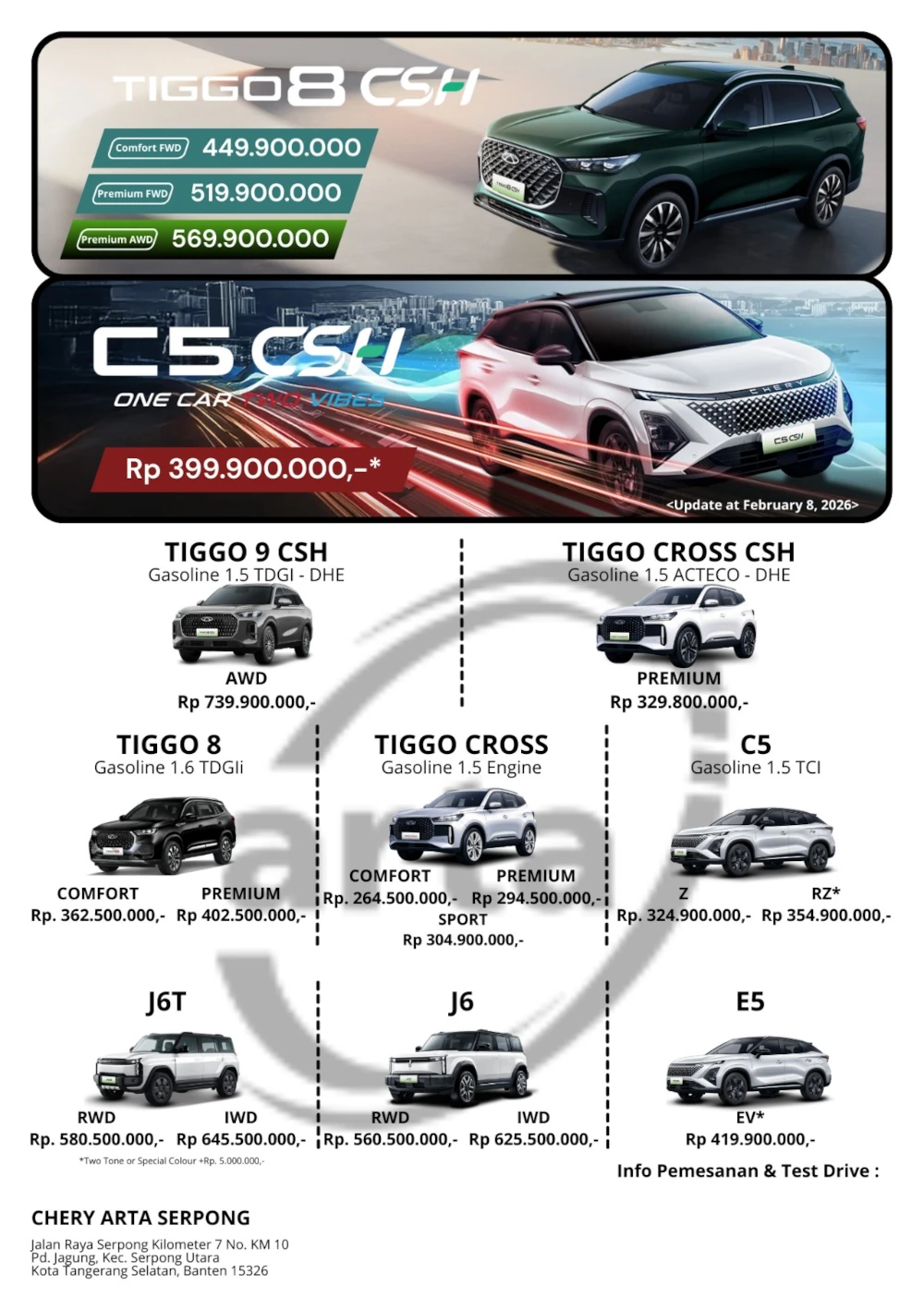 Berikut ini daftar harga resmi mobil Chery terbaru 2026